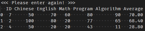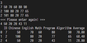 Please record the data in the table according to the student ID, Chinese language, English, mathematics, program, algorithm, average, and sort the table from the average score high to low. If the average score is the same, please sort by student ID from small to large. By the way, please take the average to the second decimal place. In addition, if the score is not between 0 and 100, then output "<<< Please enter again! >>>" and re-enter until the conditions are met.
